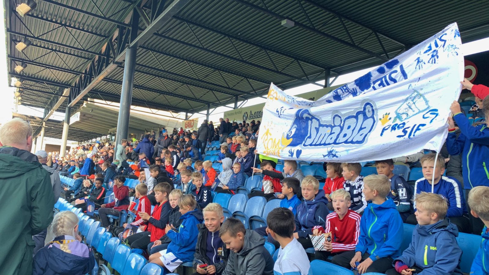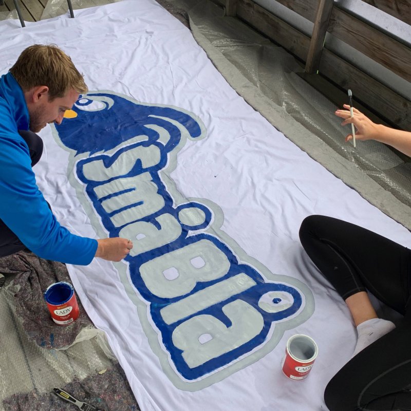 Her ønsker vi hjelp fra dere hjemme. Vi har kjøpt inn et stort parti med hvitt og blått stoff som skal legges ut som bannere på tribunen. Vi oppfordrer derfor alle som ønsker det til å bidra med å dekorere disse bannerne hjemmefra.