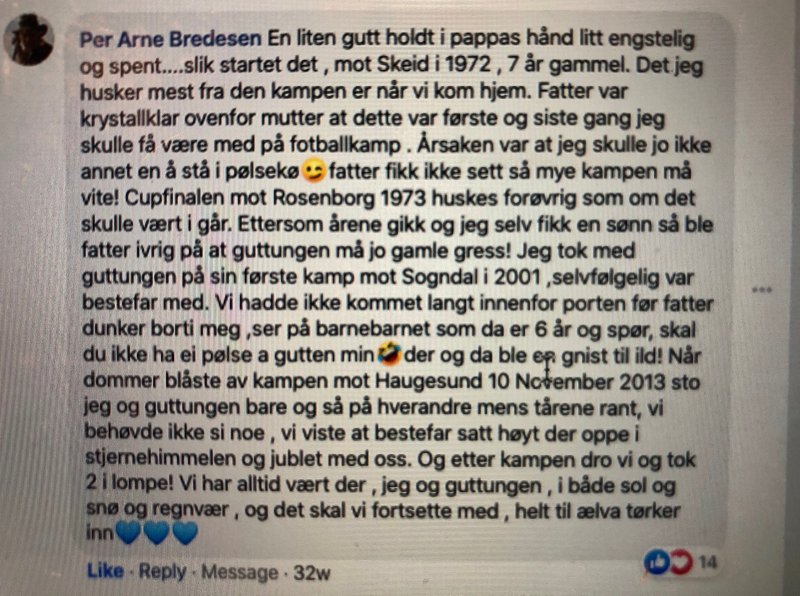Per Arne Bredesen beskrev det fint med egne ord i et innlegg på klubbens Facebook-side der vi utfordret fansen til å skrive historier om ekte kjærlighet.