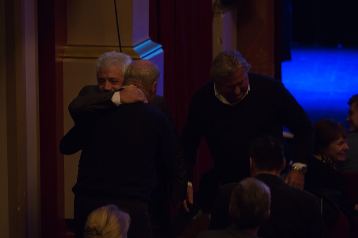 Det ble en flott nostalgisk tilsnitt på kvelden i teateret da Keegan fikk møte Tor Alsaker-Nøstdahl og Helge Karlsen - 43 år etter de spilte mot hverandre på Ullevaal stadion. Keegan ga de to Godset-legendene en real klem.