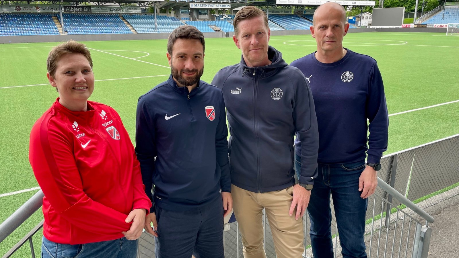 Bildetekst: Guro Øen (t.v.), koordinator for Sone Nedre Buskerud, Mounir Hamoud, spillerutvikler NFF Buskerud, Magne Jordan Nilsen, daglig leder i SIF, Jarle Finnestrand (t.h.), sportslig leder for damelaget i SIF