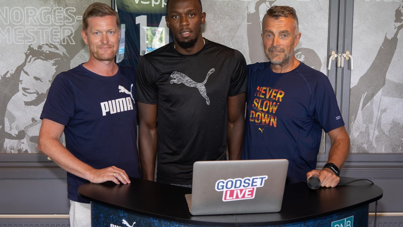 Pumas spydspiss er en av verdens beste idrettsutøvere gjennom alle tider, og en av verdens mest kjente personer. Likevel sa han raskt ja på spørsmål om å være med Magne Jordan Nilsen og Geir Amundsen i Godset Live fra VIP-corner som gikk direkte ut på Facebook.