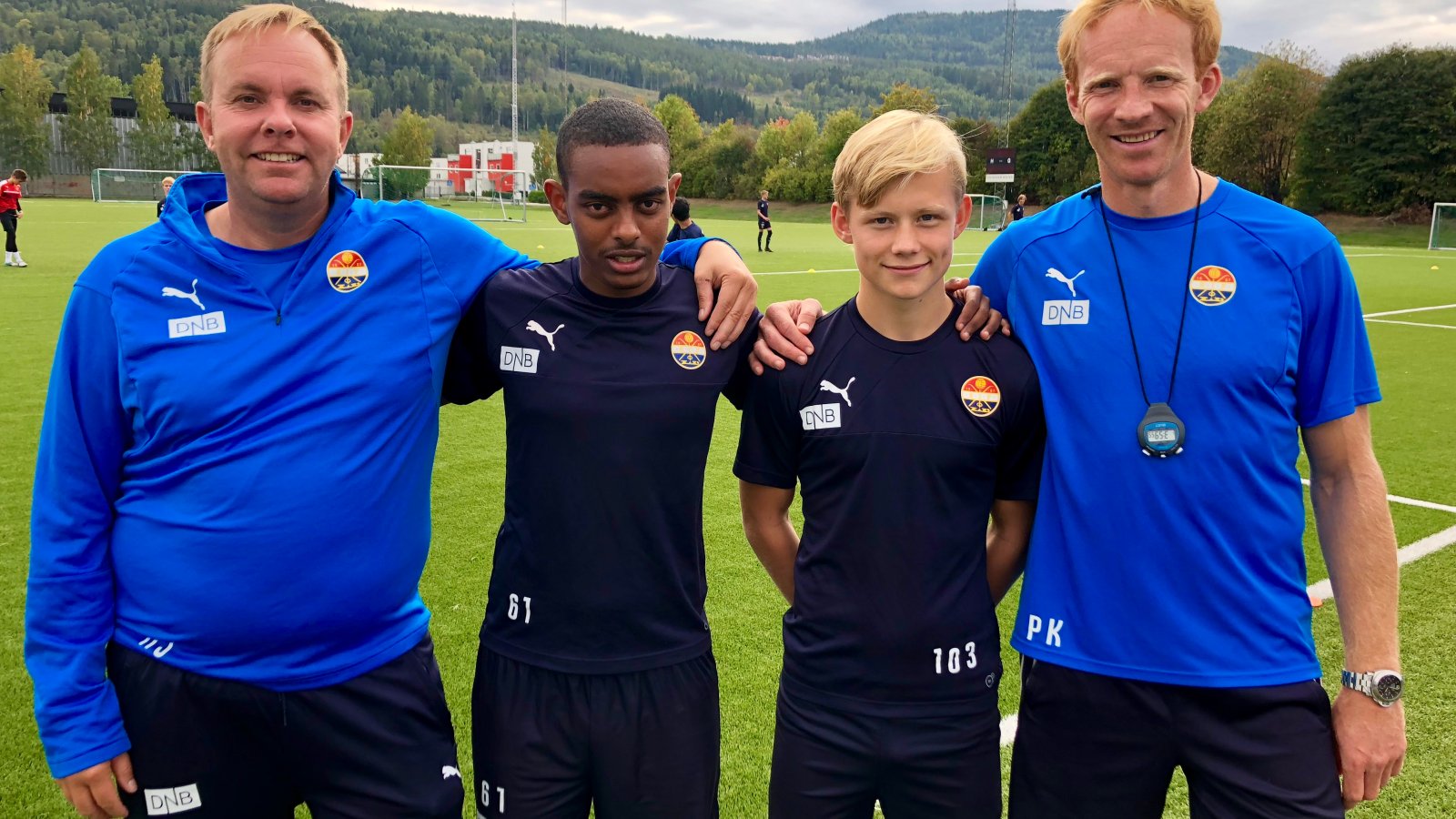 Godset-duoen Daniel Hamde og Tobias Fjeld Gulliksen er tatt ut på G15-landslaget som skal spille dobbeltlandskamp mot Sverige. Her er gutta sammen med G16-trener Harald Johannessen og spillerutvikler Peter Kovacs.